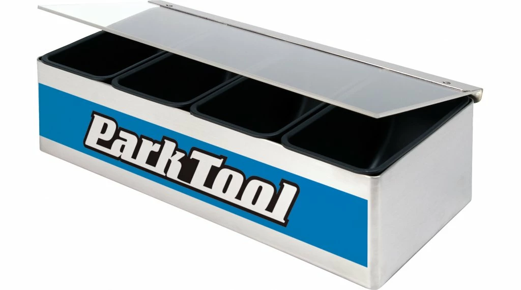 Idéal pour le stockage en toute sécurité de petites pièces, embouts, dépôts de graisse et bien plus encore. Fabriqué en acier inoxydable avec couvercle en acrylique transparent et quatre bols amovibles (30,5 x 14 x 9 cm).